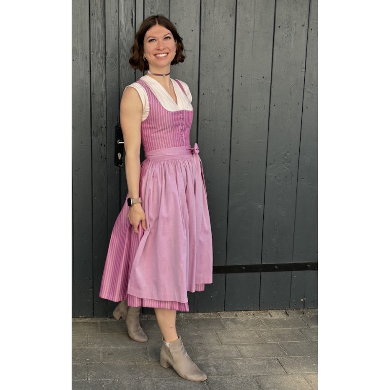 Die rosé melierte Baumwollschürze ergänzt das Gesamtbild harmonisch und unterstreicht den festlichen Charakter des Modells.